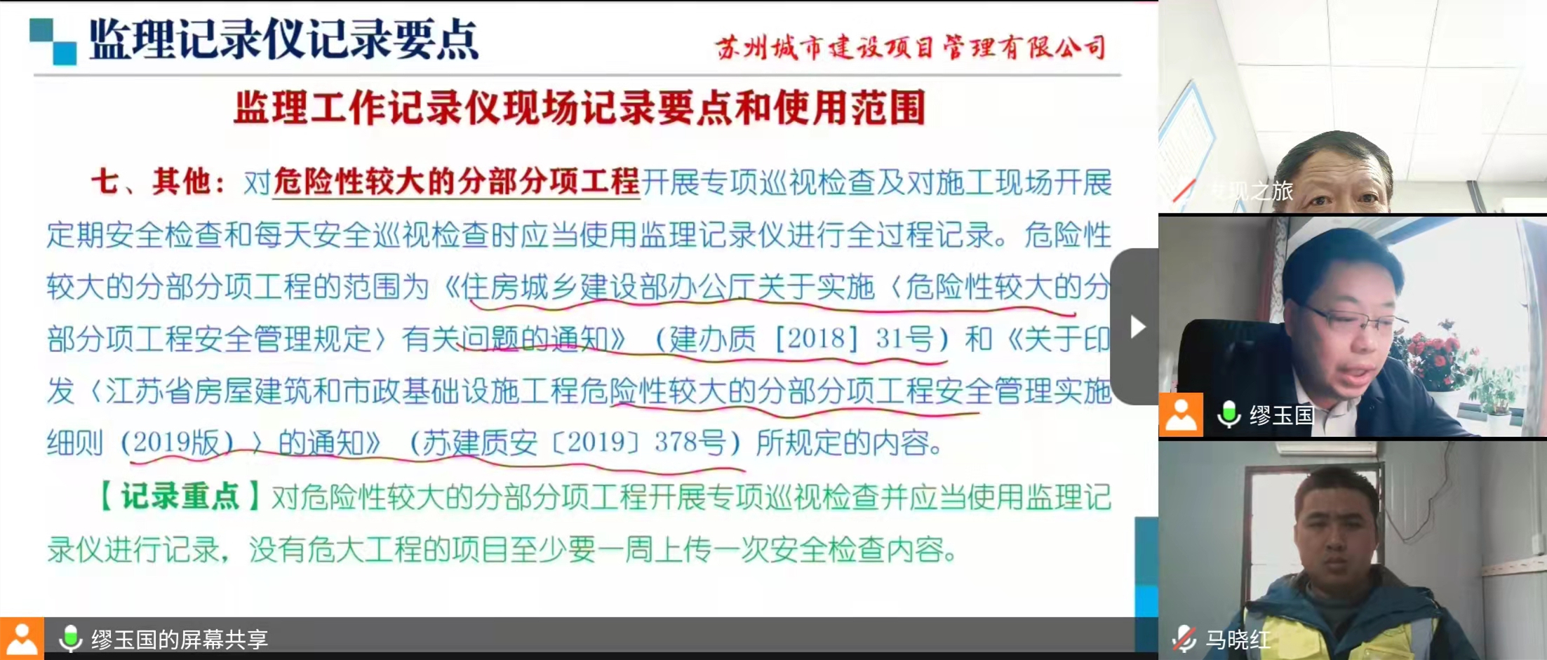 3月26日下午,為進(jìn)一步貫徹執(zhí)行好《蘇州市住建局關(guān)于加強(qiáng)建筑施工現(xiàn)場(chǎng)質(zhì)量安全監(jiān)理監(jiān)管的若干意見》(蘇住建建[2019]43號(hào))及《蘇州市建筑工程施工安全生產(chǎn)專業(yè)委員會(huì)辦公室——關(guān)于進(jìn)一步加強(qiáng)工程監(jiān)理企業(yè)現(xiàn)場(chǎng)監(jiān)管的通知》(蘇建筑安全委辦〔2022〕14號(hào))等文件精神,切實(shí)落實(shí)監(jiān)理企業(yè)現(xiàn)場(chǎng)監(jiān)管職責(zé)、強(qiáng)化監(jiān)理責(zé)任、更加規(guī)范地使用好“現(xiàn)場(chǎng)質(zhì)量安全監(jiān)理監(jiān)管平臺(tái)”和“監(jiān)理記錄儀”、全面提升公司所有建筑施工現(xiàn)場(chǎng)質(zhì)量安全監(jiān)管水平、努力實(shí)現(xiàn)建筑施工安全生產(chǎn)“零事故”既定目標(biāo),根據(jù)公司工作計(jì)劃、結(jié)合在建工程實(shí)際情況,公司組織 “現(xiàn)場(chǎng)質(zhì)量安全監(jiān)理監(jiān)管平臺(tái)”和“監(jiān)理記錄儀”的使用線上直播培訓(xùn)宣貫。公司常務(wù)副總、總工程師繆玉國主持會(huì)議并全程宣貫。