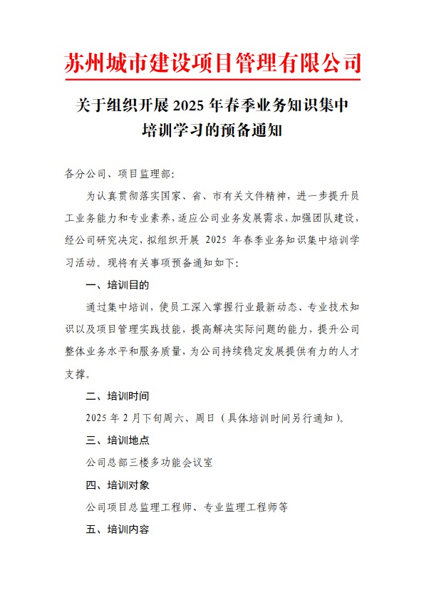 公司關于組織開展2025年春季業務知識集中培訓學習的預備通知