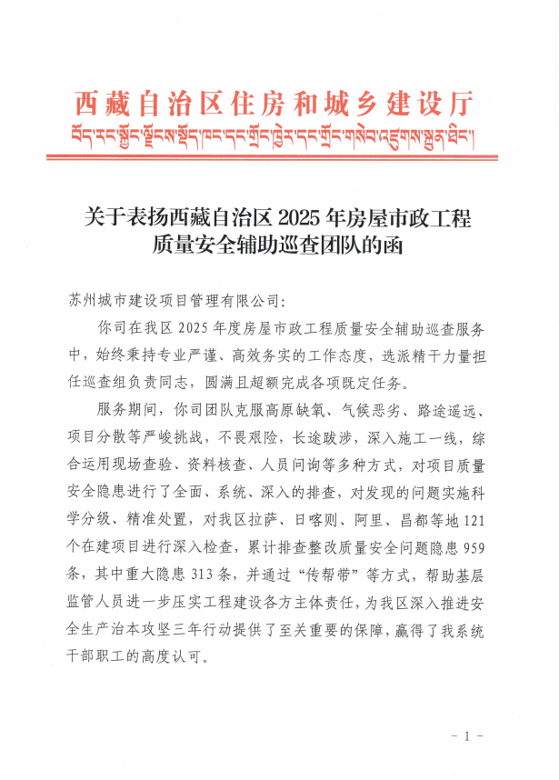 2025年12月1日,蘇州城市建設(shè)項(xiàng)目管理有限公司收到西藏自治區(qū)住房和城鄉(xiāng)建設(shè)廳發(fā)來(lái)的表?yè)P(yáng)信。這已是公司連續(xù)第六年獲得西藏住建系統(tǒng)的書(shū)面表彰。信中對(duì)公司巡查團(tuán)隊(duì)在承擔(dān)的西藏自治區(qū)2025年度在建項(xiàng)目巡查中“始終秉持專(zhuān)業(yè)嚴(yán)謹(jǐn)、高效務(wù)實(shí)的工作態(tài)度”,“克服高原缺氧、氣候惡劣、路途遙遠(yuǎn)、項(xiàng)目分散等嚴(yán)峻挑戰(zhàn)”,圓滿(mǎn)完成全區(qū)121個(gè)在建項(xiàng)目巡查任務(wù)給予高度認(rèn)可與充分肯定。