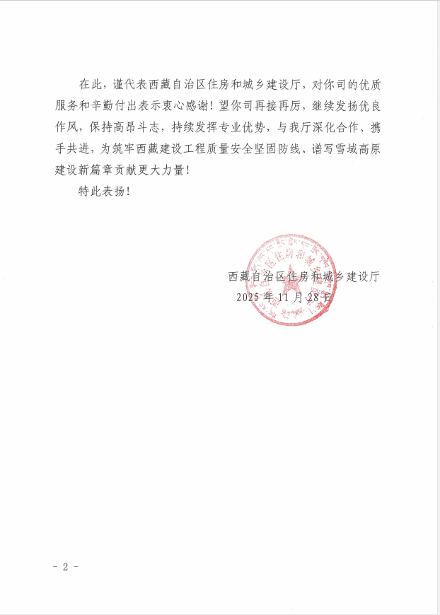 這份來(lái)自雪域高原的認(rèn)可,既是對(duì)公司專(zhuān)業(yè)能力與服務(wù)品質(zhì)的持續(xù)肯定,更是對(duì)團(tuán)隊(duì)扎根一線、擔(dān)當(dāng)實(shí)干精神的莫大鼓舞。公司將珍惜榮譽(yù)、再接再厲,把這份認(rèn)可轉(zhuǎn)化為前進(jìn)動(dòng)力,堅(jiān)持在服務(wù)中不斷提升團(tuán)隊(duì)綜合業(yè)務(wù)能力,繼續(xù)嚴(yán)格按照區(qū)住建廳要求,以更專(zhuān)業(yè)的服務(wù)為西藏自治區(qū)工程建設(shè)質(zhì)量安全保駕護(hù)航,扎實(shí)做好后續(xù)服務(wù)保障工作,在雪域高原續(xù)寫(xiě)服務(wù)新篇章。